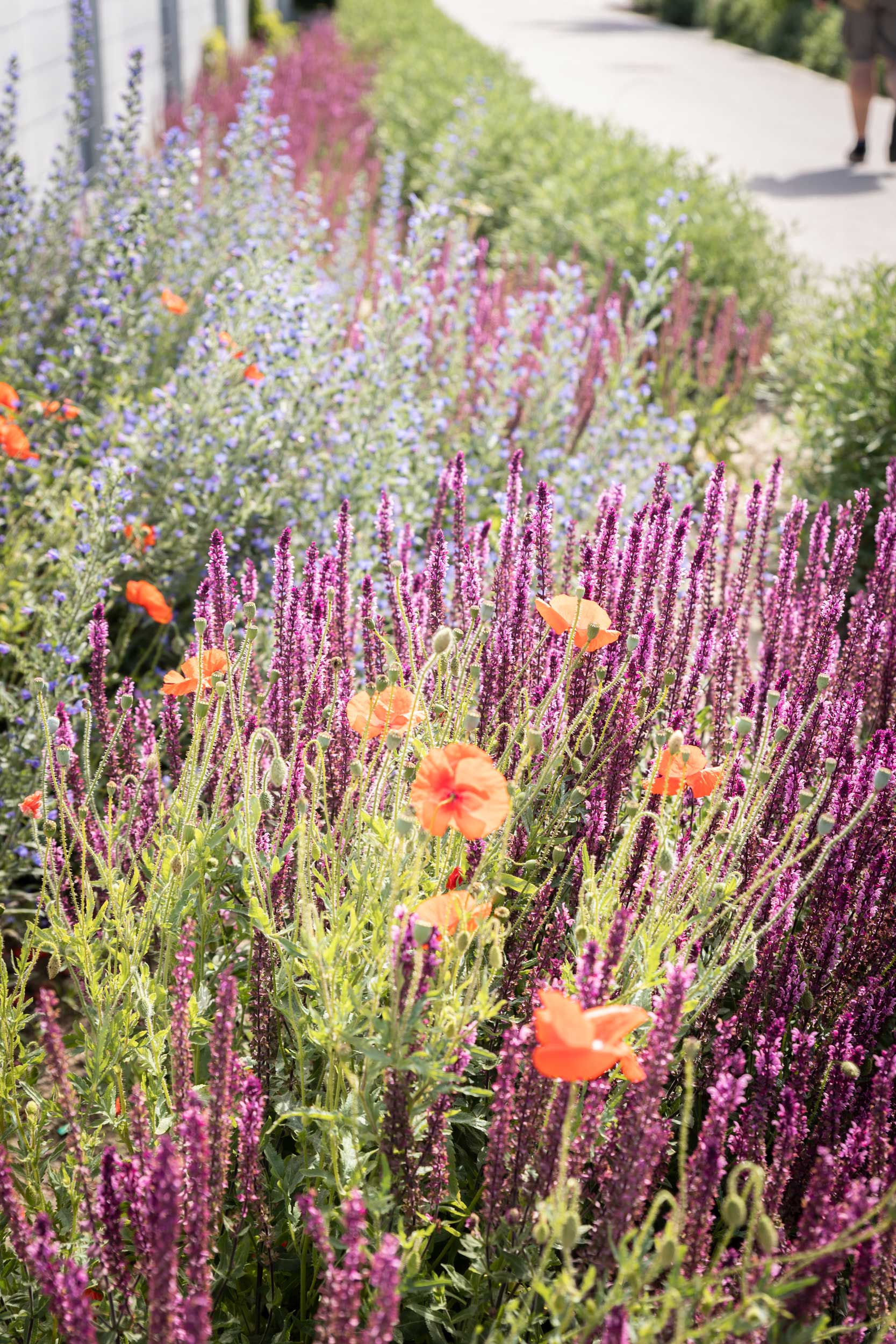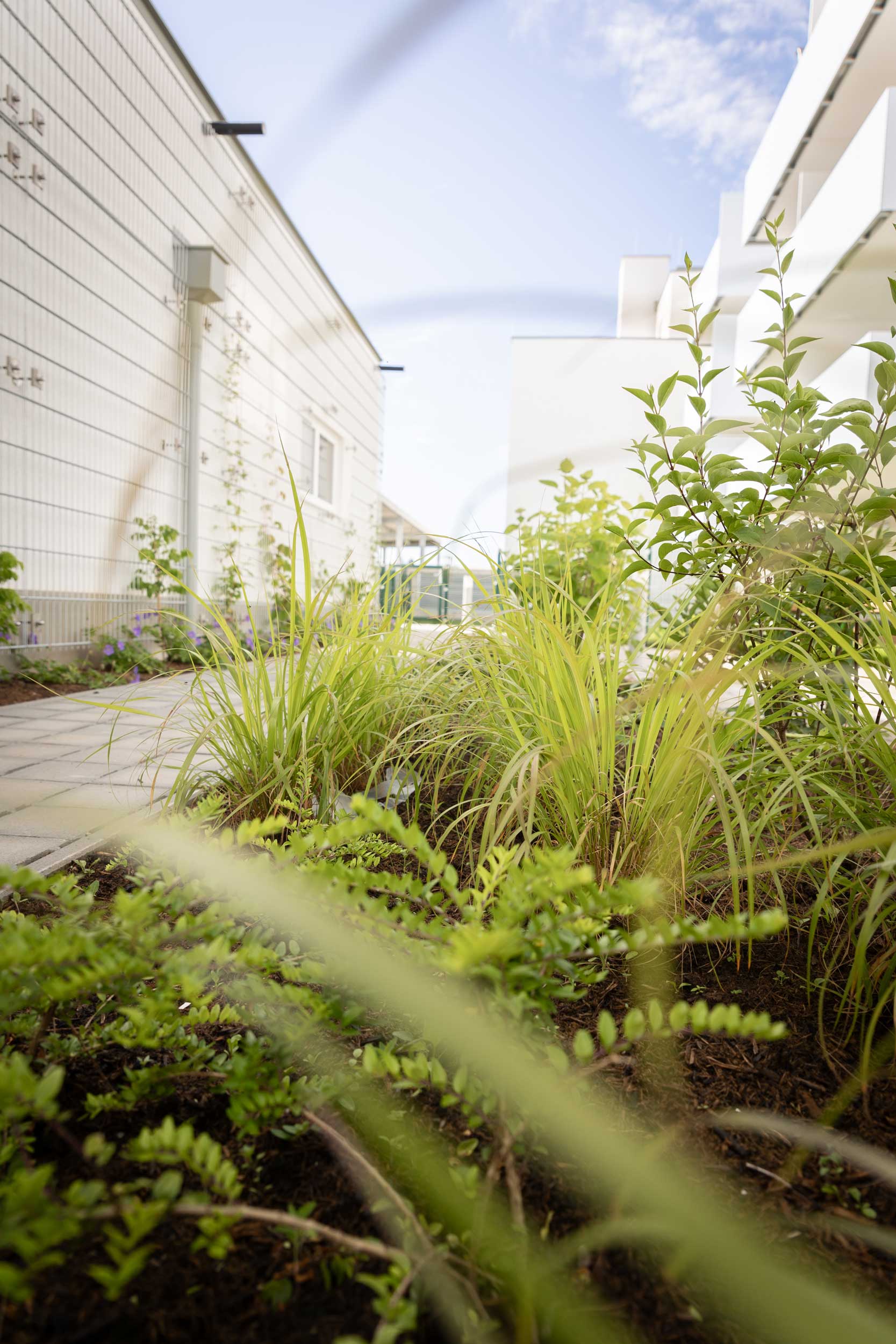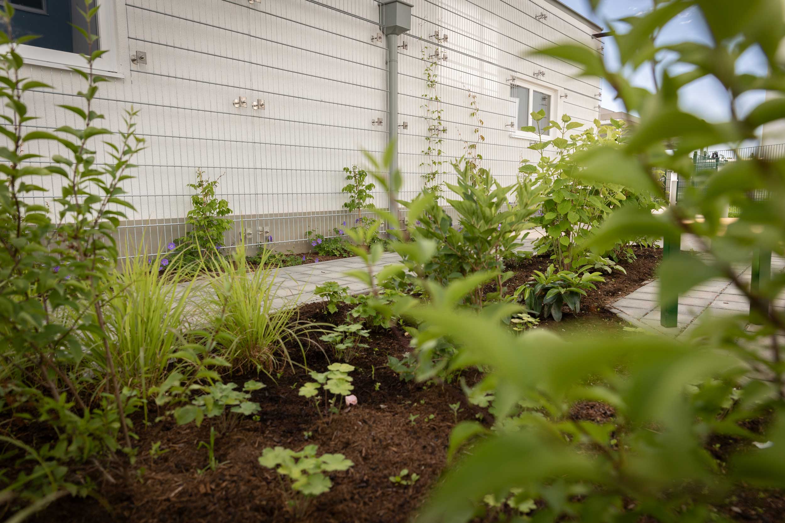 Hier darf es blühen und wachsen: In den Außenanlagen dieser Wohnhaussiedlung sprießt es auch noch in den kleinsten Grünstreifen neben den gepflasterten Wegen.